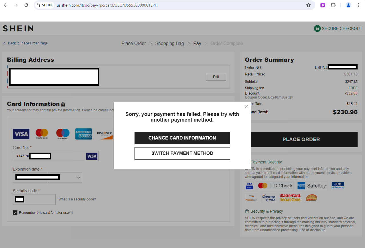 tried to make a purchase on shein with no success,