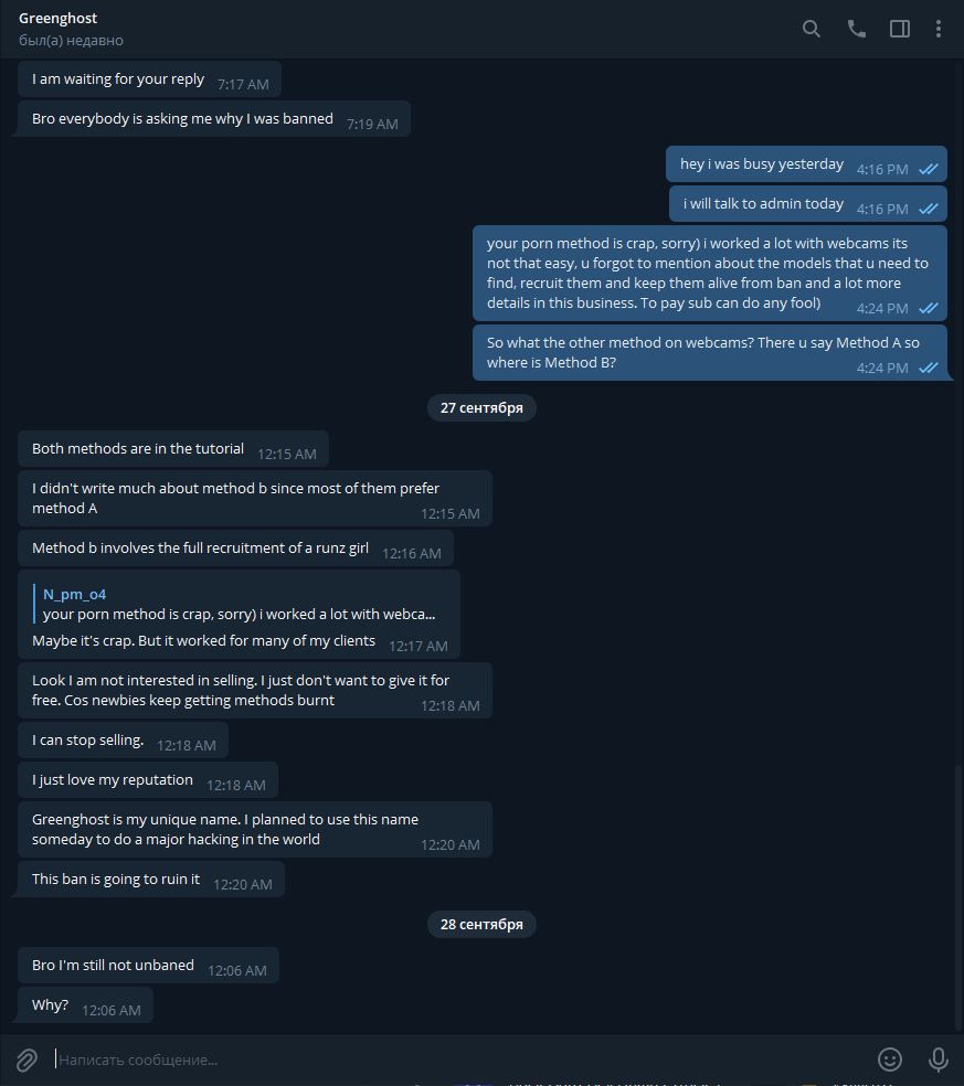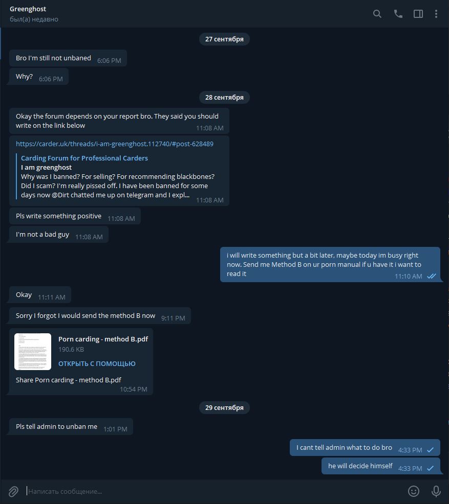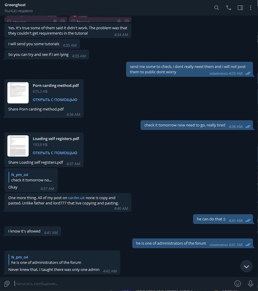Ничего плохого и хорошего я не могу сказать по поводу данного персонажа. Я не покупал у него мануалы и даже не имел никаких дел с ним. Да он мне накинул +2 репы, мне было интересно за что его забанили, по просьбе Админа я поговорил с ним в тг. В общем он кинул мне пару мануалов, один из мануалов который мне был интересен в связи с тем что знаю многое по этой теме, это "Порно" мануал - так он сам его назвал. Я спросил у него за метод B, потому как в данном мануале описан только метод А (он даже указан как Метод А). Он сказал скину, но пропал. На следующее утро, т.е. сегодня он скинул метод B, уверен он его написал за то время после того как пообещал скинуть, т.е. у него небыло его сразу в наличии, это видно по времени, когда он мне скинул метод В (см.скриншоты), написав мне что забыл, ну да ладно. Сказать что мануал какой то приватный, то нет, этой инфы в достатке на форуме, так же как и второй мануал по получению займа который он мне скинул, я так и не понял, какой то "to load your self registers", точно под что мануал не понятно. Но по набору инструментов и описанию которые там упомянуты, кажется что получение займа (Loan) в Bank of America. Как по мне тема заезжена до не могу, особенно Банк Америки, ладно там какой то колхозный банк где то на границе с Мексикой, о котором не многие знают, но это Банк мать его Америки, главный вроде банк, могу и ошибаться конечно. Не имел дел с займами, кредитами и ПУА, к сожалению, да и не понаслышке знаю что темы эти уже задрочены вдоль и поперек, от знакомых мне людей.
