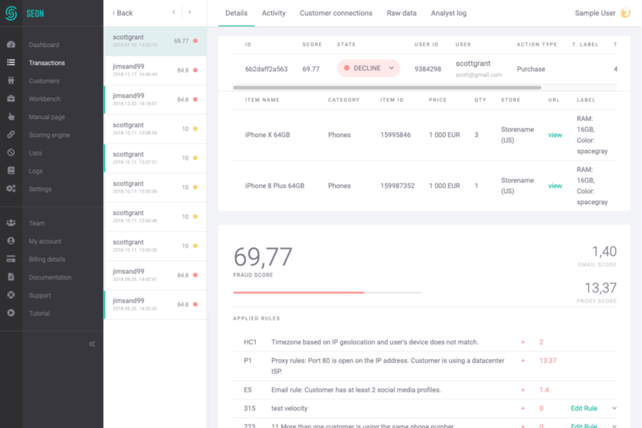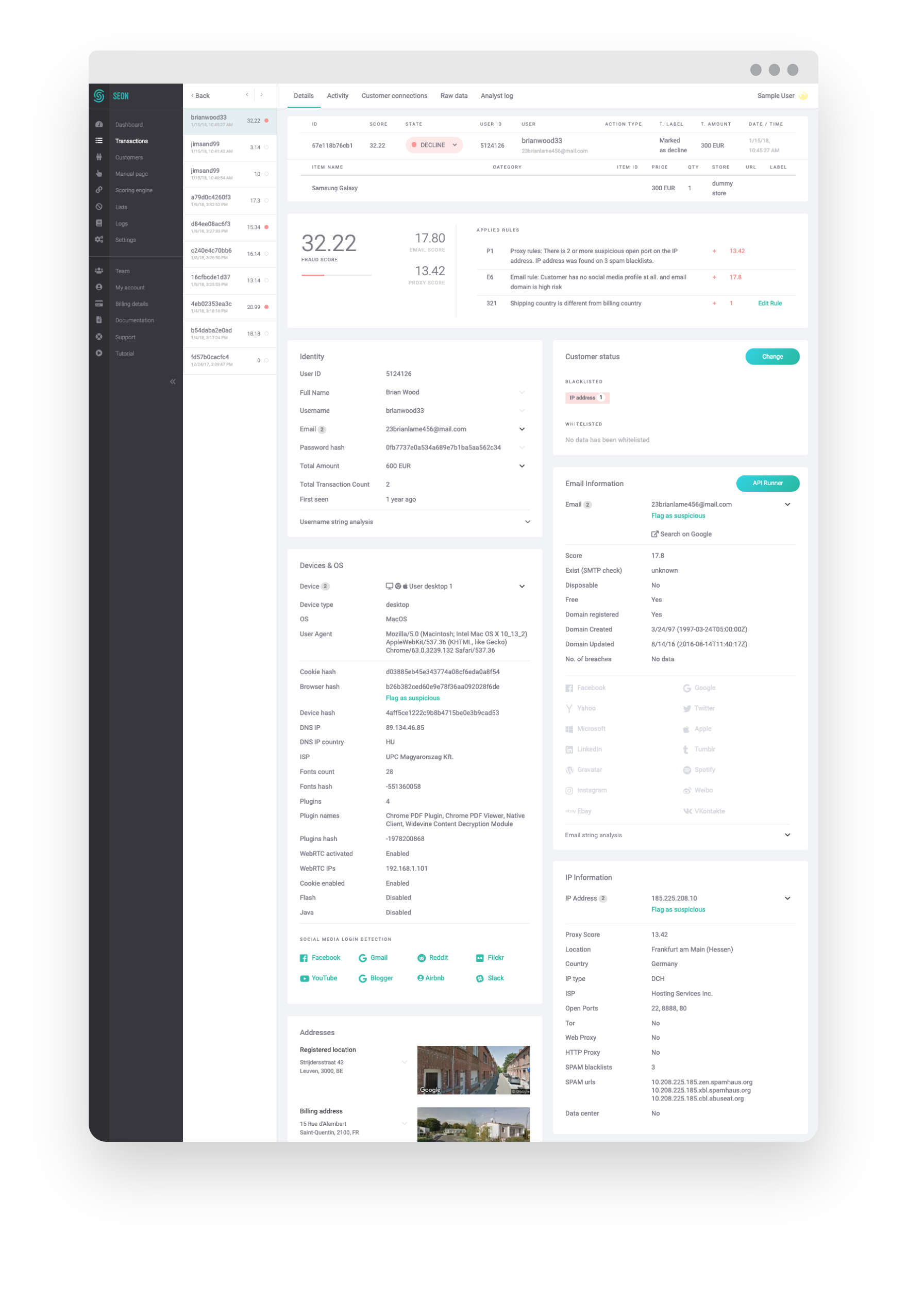 SEON это небольшая отдельная АФ система, она не встроена в мерч и может быстро подключаться к любой сфере IT бизнеса, будь то коммерция, банкинг, онлайн игры или путешествия. Компания работает с двумя продуктами - Sense platform и Intelligence tool.