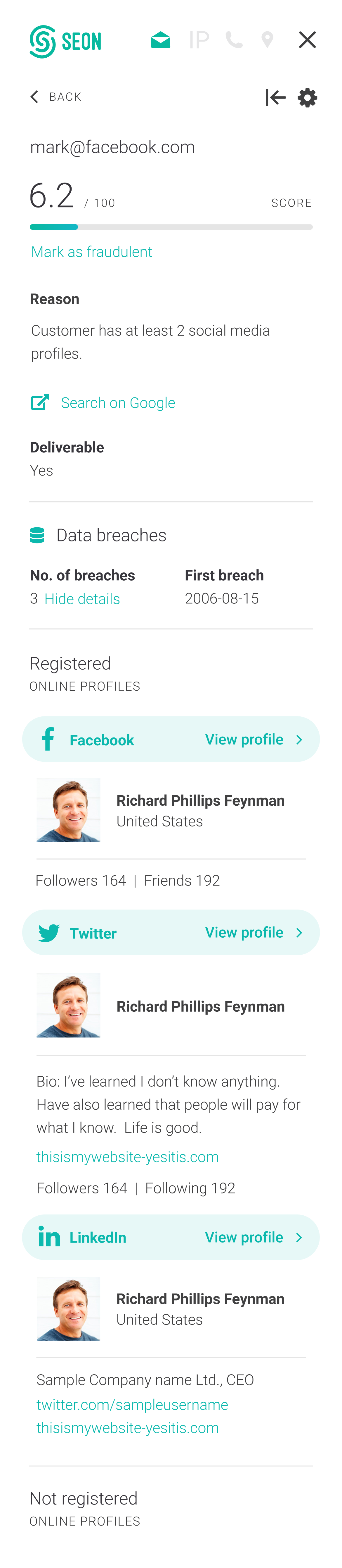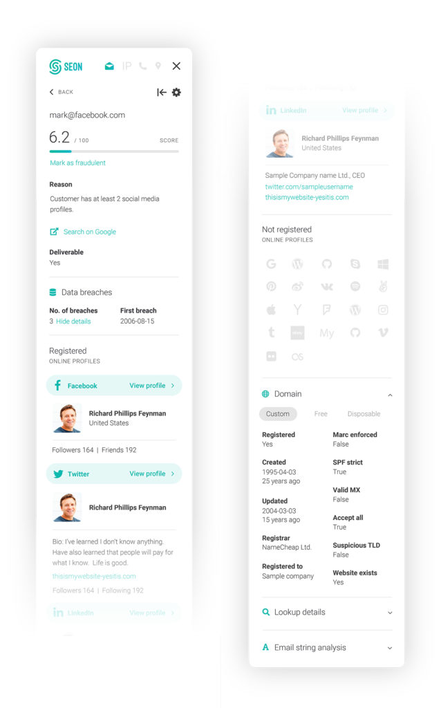 И как говорят сами разработчики SEON: Сочетание данных адреса электронной почты, телефонного номера, данных об устройстве и IP-адресе может создать очень полное представление о пользователе, что может помочь отделить мошенников от реальных пользователей с повышенной точность.