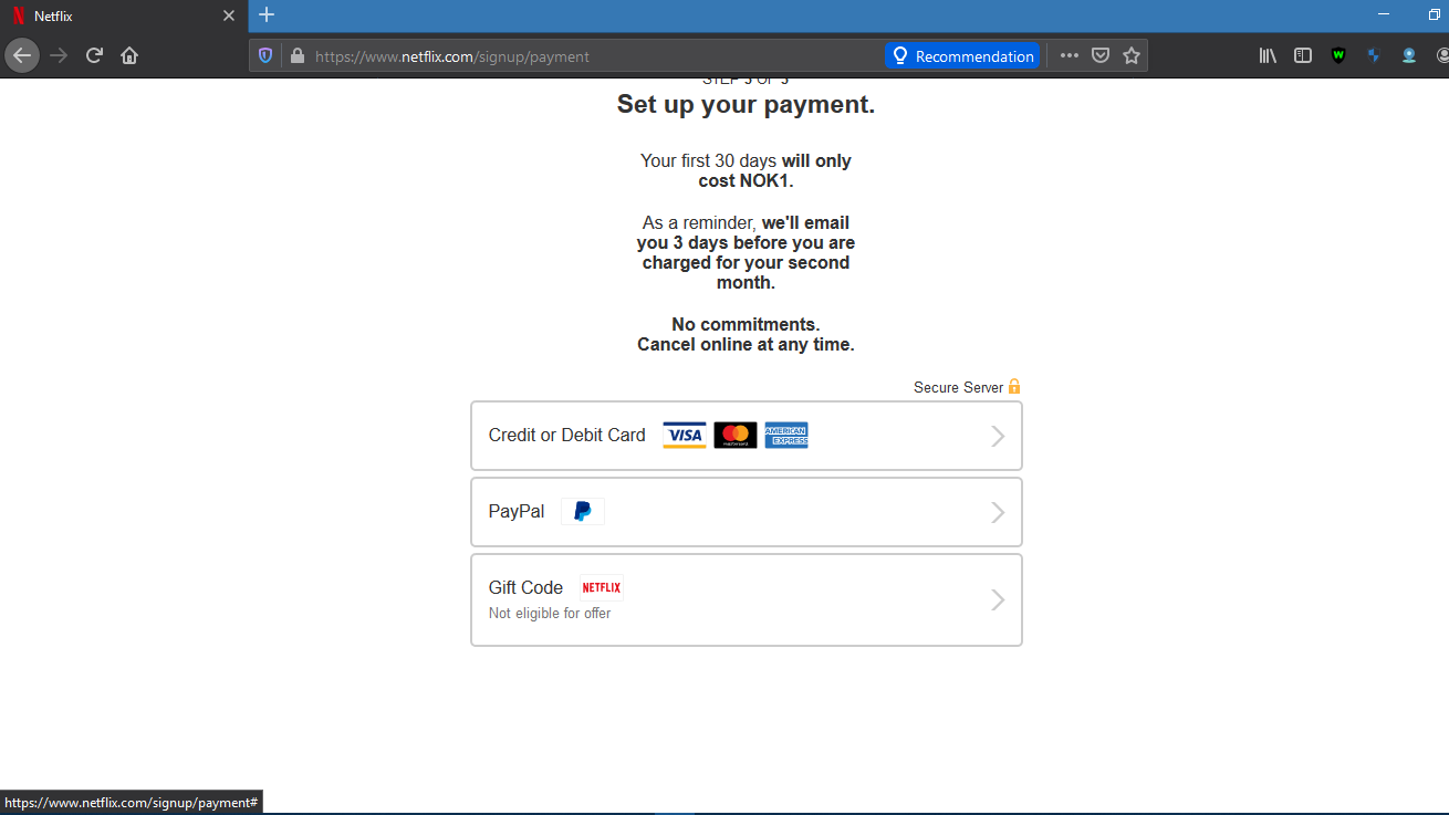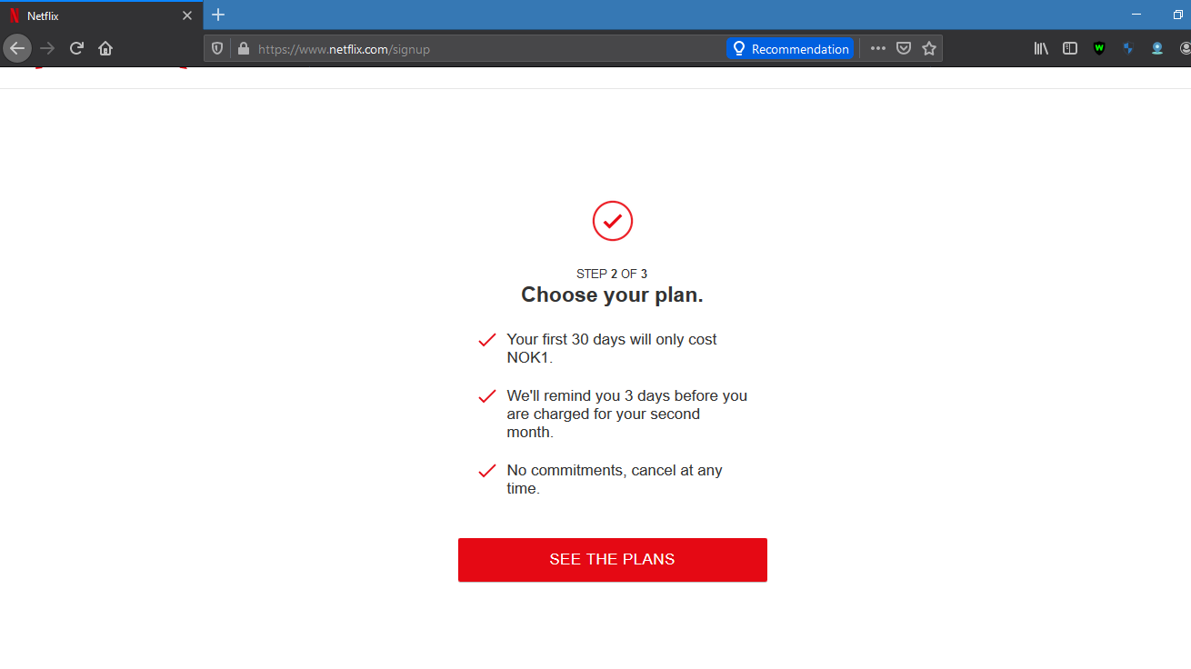 6. ШАГ 2 из 3 Выберите свой тарифный план. Ваши первые 30 дней будут стоить всего 1 норвежскую крону (платить не нужно). Выберите план и нажмите «Продолжить». Без обязательств, отменить в любой момент.