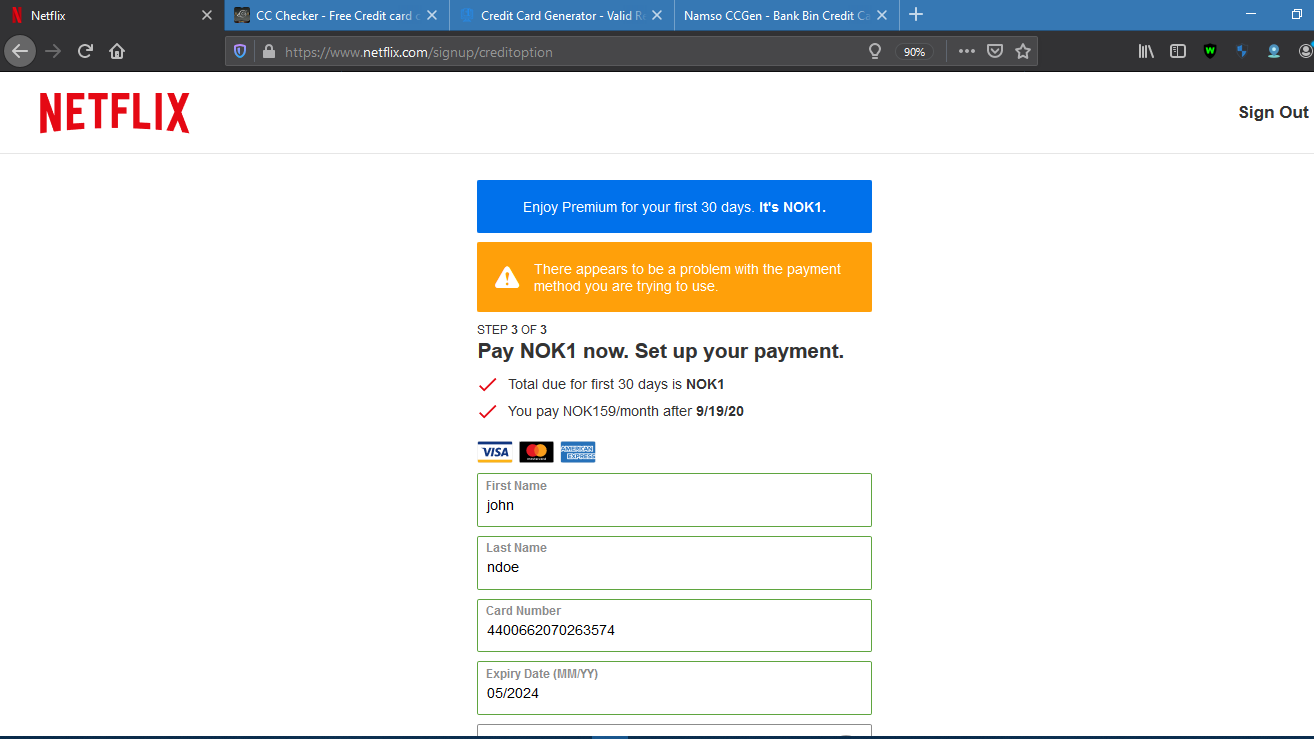 9. Теперь это та часть, которую мы собираемся проверить, защищена ли карта 3D или нет, мы собираемся использовать платежный процессор Netflix для проверки карты. Используйте данные карт, которые у вас уже есть, или сгенерируйте карты с предпочитаемыми ячейками. Например, я использую BIN 440066, из которого я сгенерировал случайные карты.