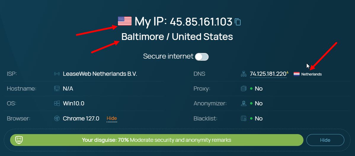 Как вы можете заметить, что днс и айпи сильно отличаются и я не понимаю почему такое, ибо это не систематичная проблема, она то есть, то её нет, то есть я создал профиль в dolphin'e, все было нормально и защита была под 90%(разность системного времени), я создал почту на имя владельца кх и случайно закрыл антик, зашел заново и заметил такую проблему, перезашел еще раз и все норм. В общем и целом мой вопрос: у кого нибудь было такое же, если да, то как решали и решили ли? С чем может бы связано это? с плохими прокси?